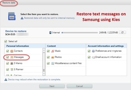 Note: Text messages in the backup file will be restored using kies. In the meantime, your new messages added after backing up are gone when syncing with kies.